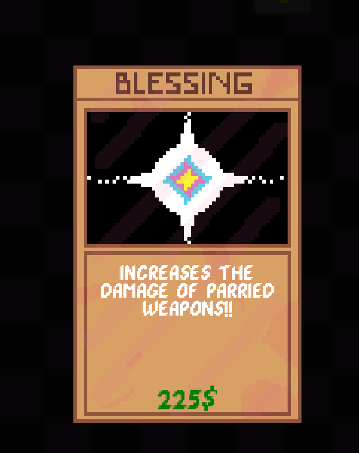 Every 5 rooms, you’ll face a boss—beat it, and you move down to the next floor. The game has two dungeon tilesets and Blessings—cards that change your character’s stats and abilities.